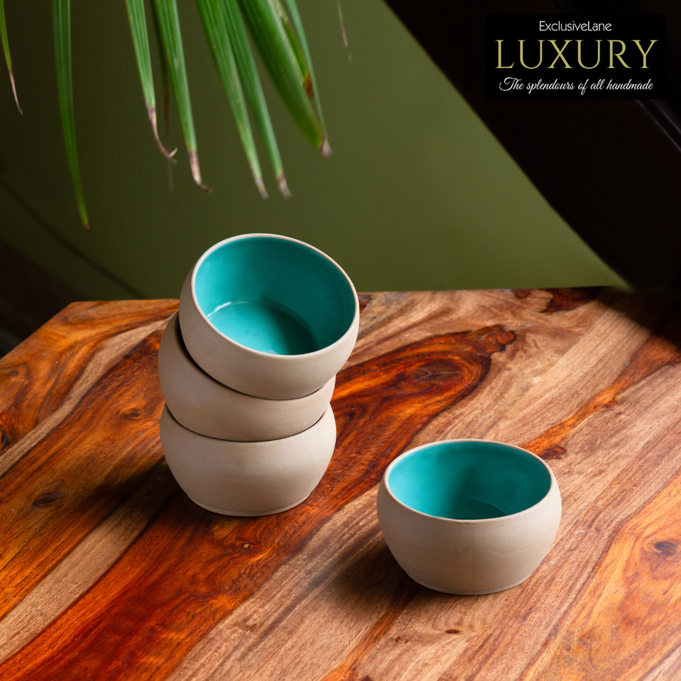 Set 4 'Earthen Turquoise' 180 ML Hand Glazed Katoris Ceramic Dining Bowls 4.5 Inch Microwave Safe India Coconut Shell Design