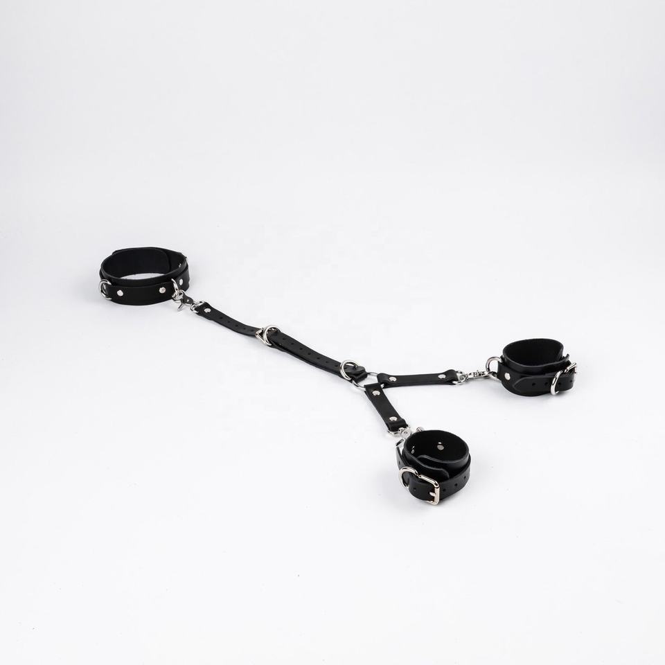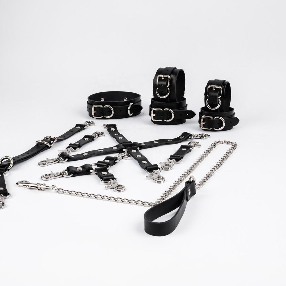 Set Cowhide Leather Wrist Ankle Cuffs Collar Back Belt Restraint and Leash Two Three Four-way Connector 11 Piece Kit BDSM-0028