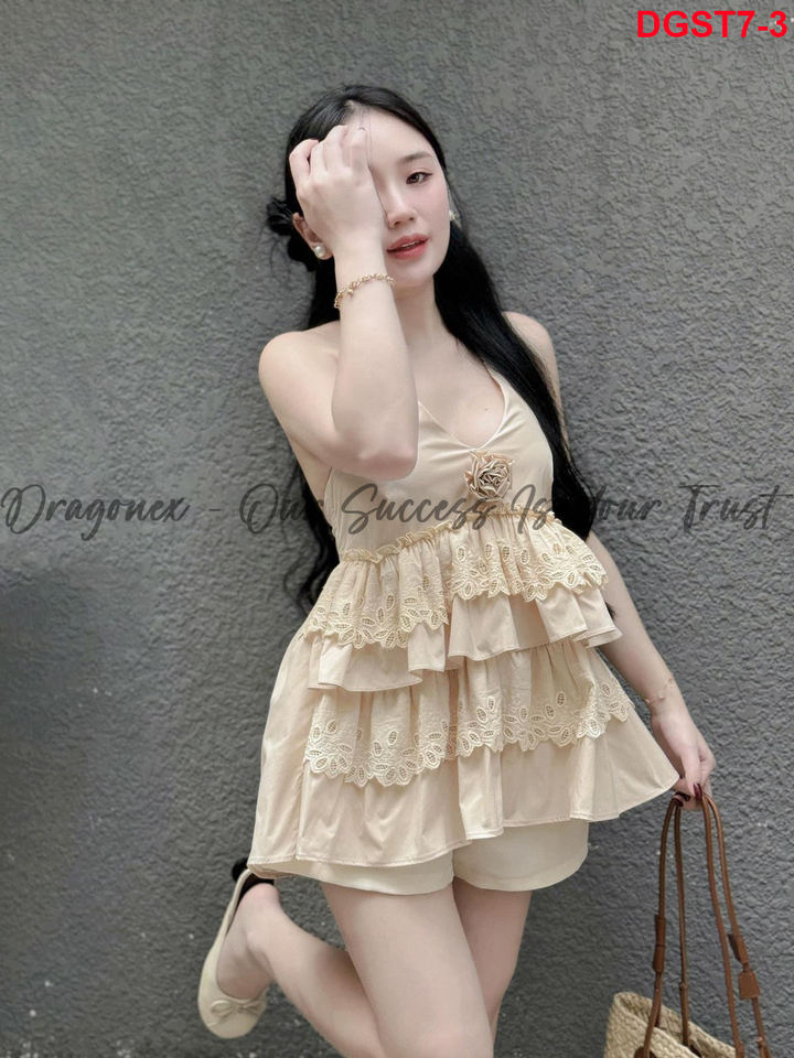 Set Designed With Rose Lace Layered Shirt in the Middle of the Chest Halter Neck and Super Cute Shorts for Girls Streetwear 2024