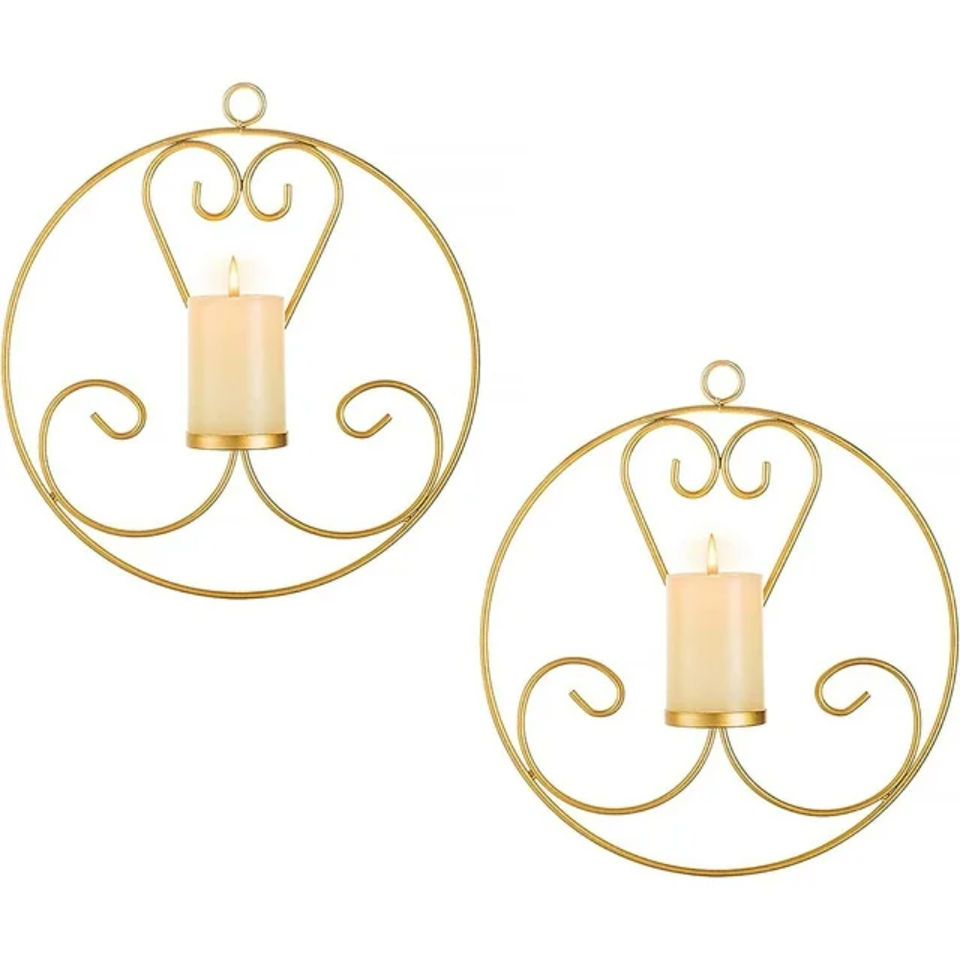 Set Of 2 Antique Gold Metal Candle Holders Vintage Style Scroll Design Wall Mounted Pillar Candle Sconces For Elegant Home Decor