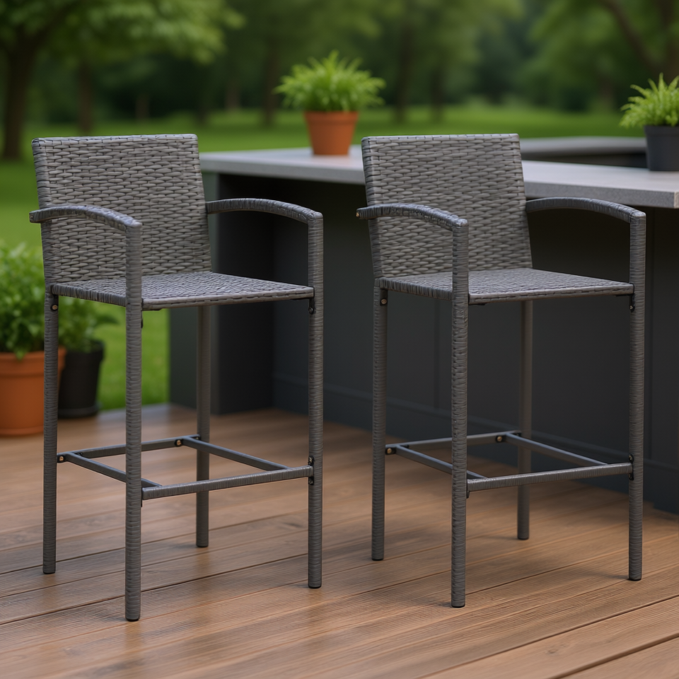 Set Of 2 Grey Pe Rattan Bar Stools With Powder Coated Steel Frame Outdoor Modern Contemporary Design