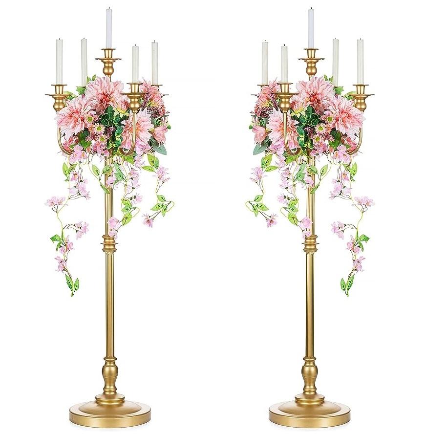 Set Of 2 Luxury Metal 5 Arms Candelabra Gold Finished Floor Candelabra For Wedding Event Party Decorations