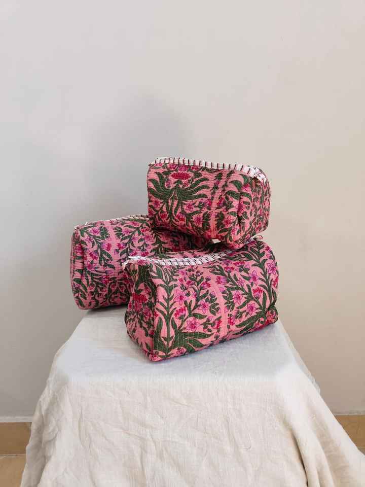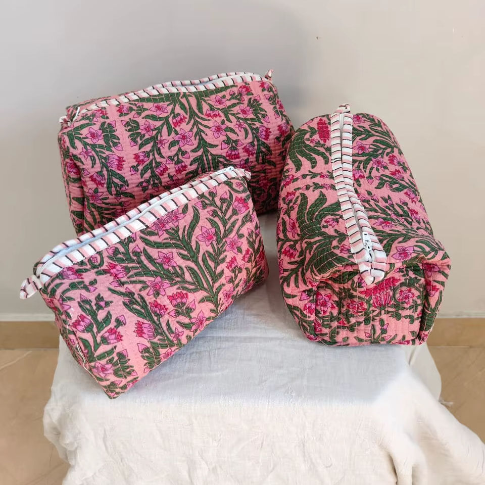 Set Of 3 Cotton Quilted Makeup Bag & Organizer Cotton Toiletry Case Travel Bag floral Print Makeup Bag Toiletries Organizer Bag