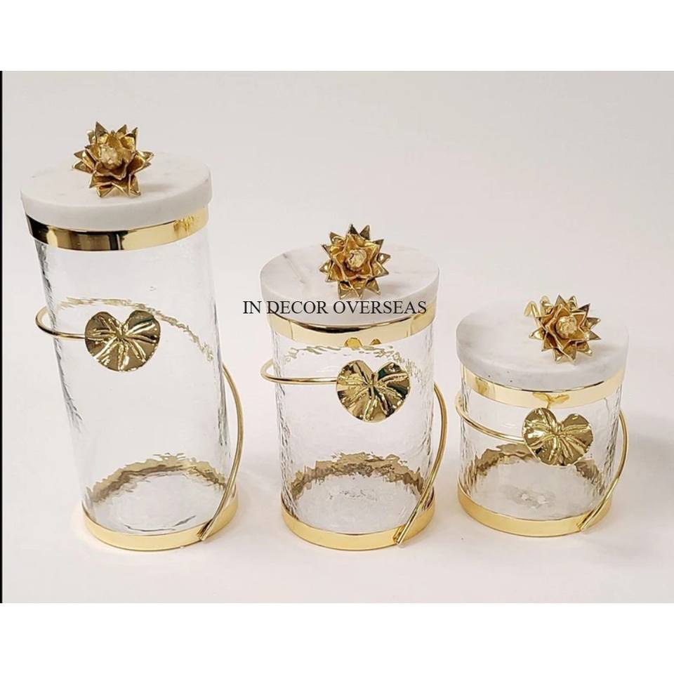 Set Of 3 High Standard Quality Metal Stylish Designer Enamel Finished Base And Top Lid With Leaves Design Clear Glass Canisters