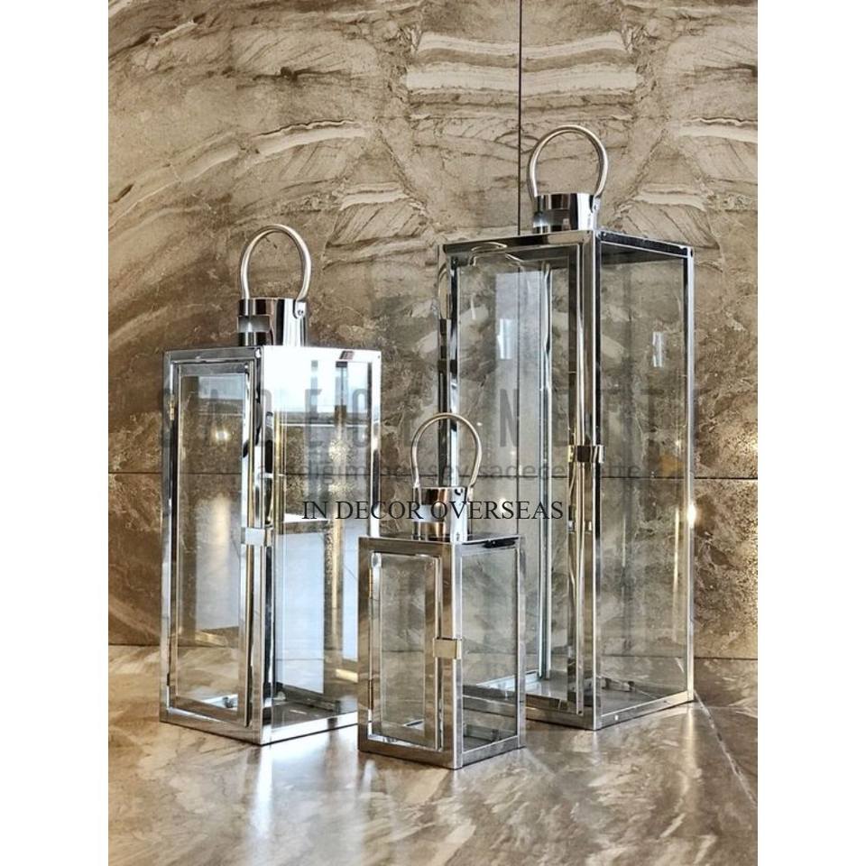 Set Of 3 Silver Shiny Polished Heavy Duty Metal And Clear Glass Made Standard Designer Candle Holder Lanterns Wedding Decor