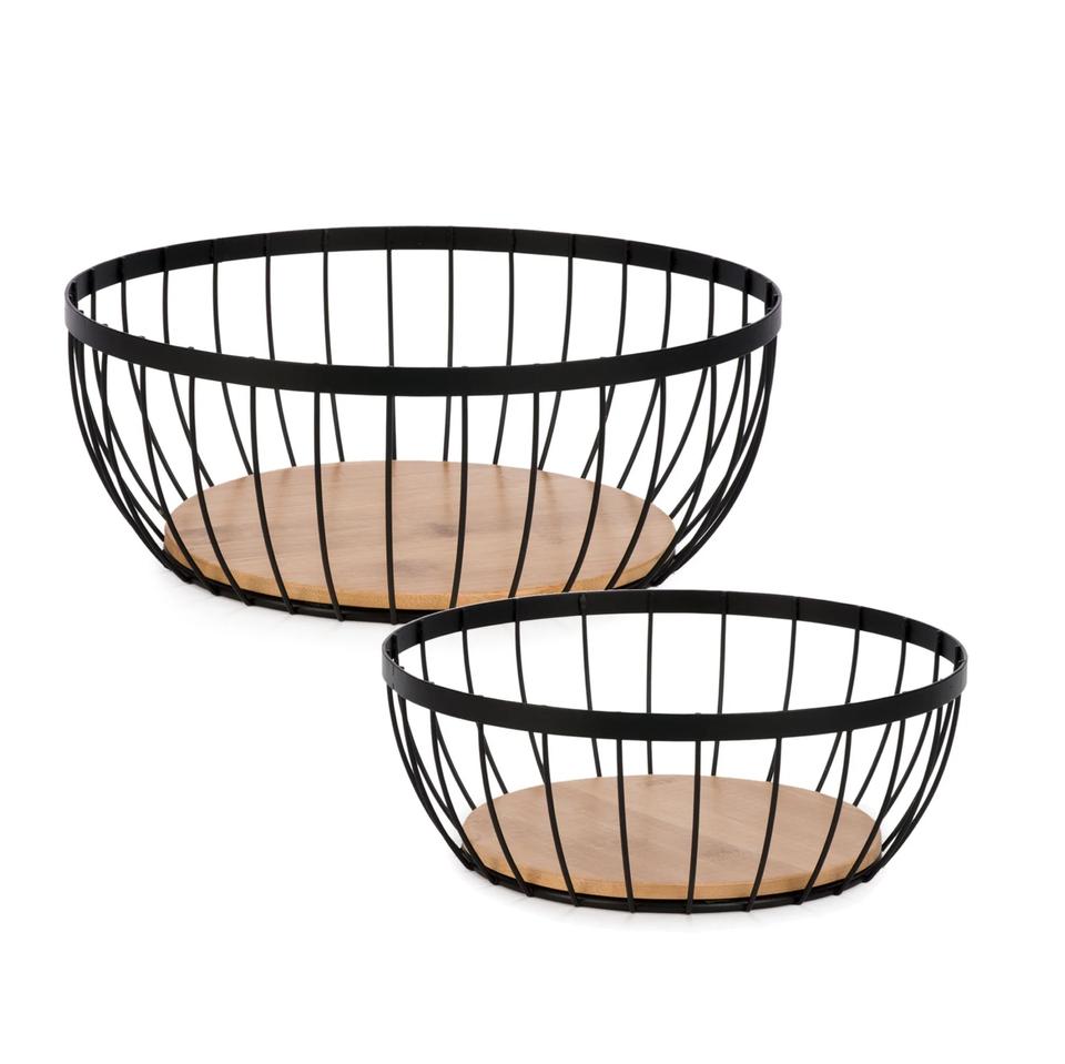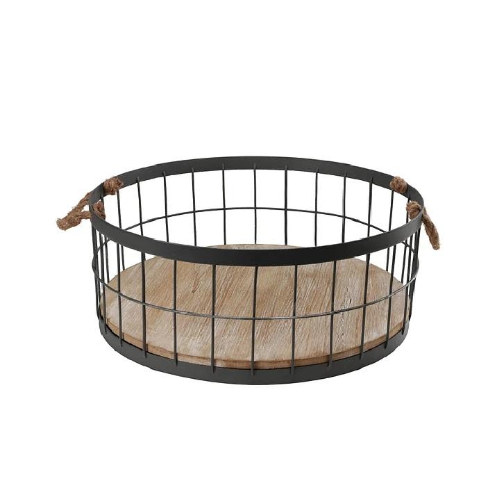 Set Of Two Wooden Base Modern Design Metal Iron Black Storage Basket Customized Size Shape Colour Logo Uses In Home And Kitchen