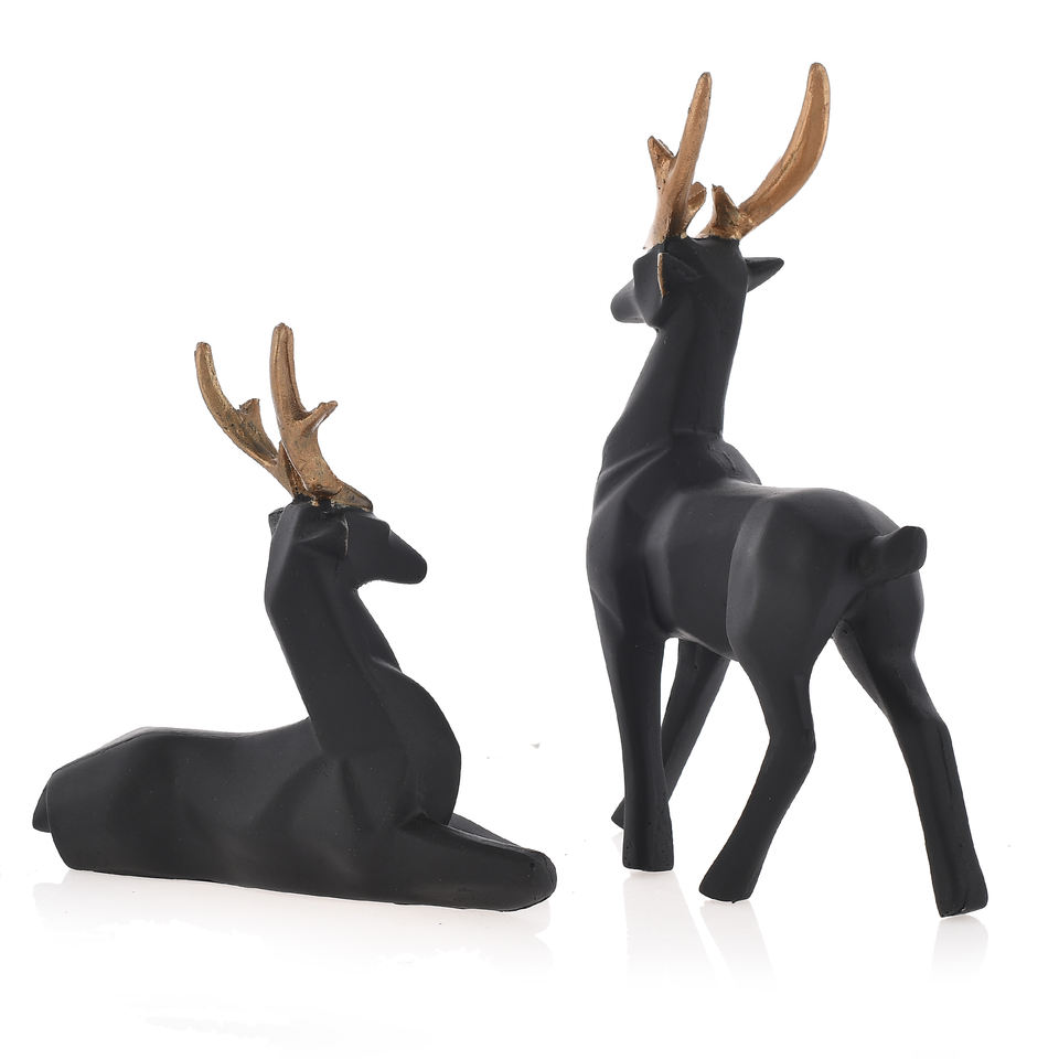Set of 2 Black Resin Deer Statues with Golden Antlers Modern Geometric Reindeer Figurines for Home & Office Decor