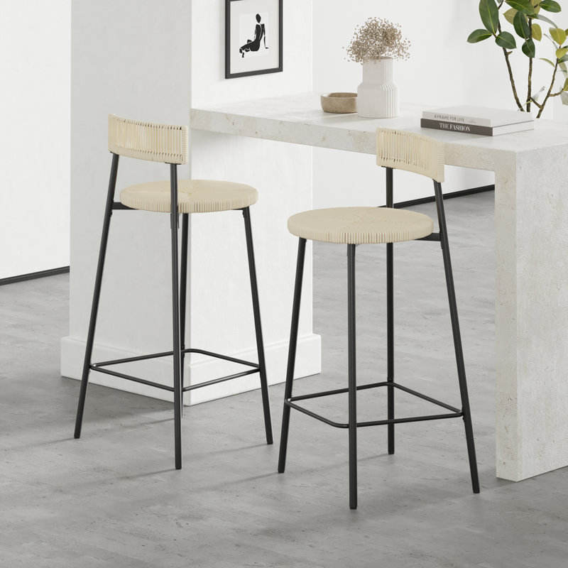 Set of 2 Boho Style Counter Stools Handwoven Paper Rope Bar Stools Round Dining Pub Chairs