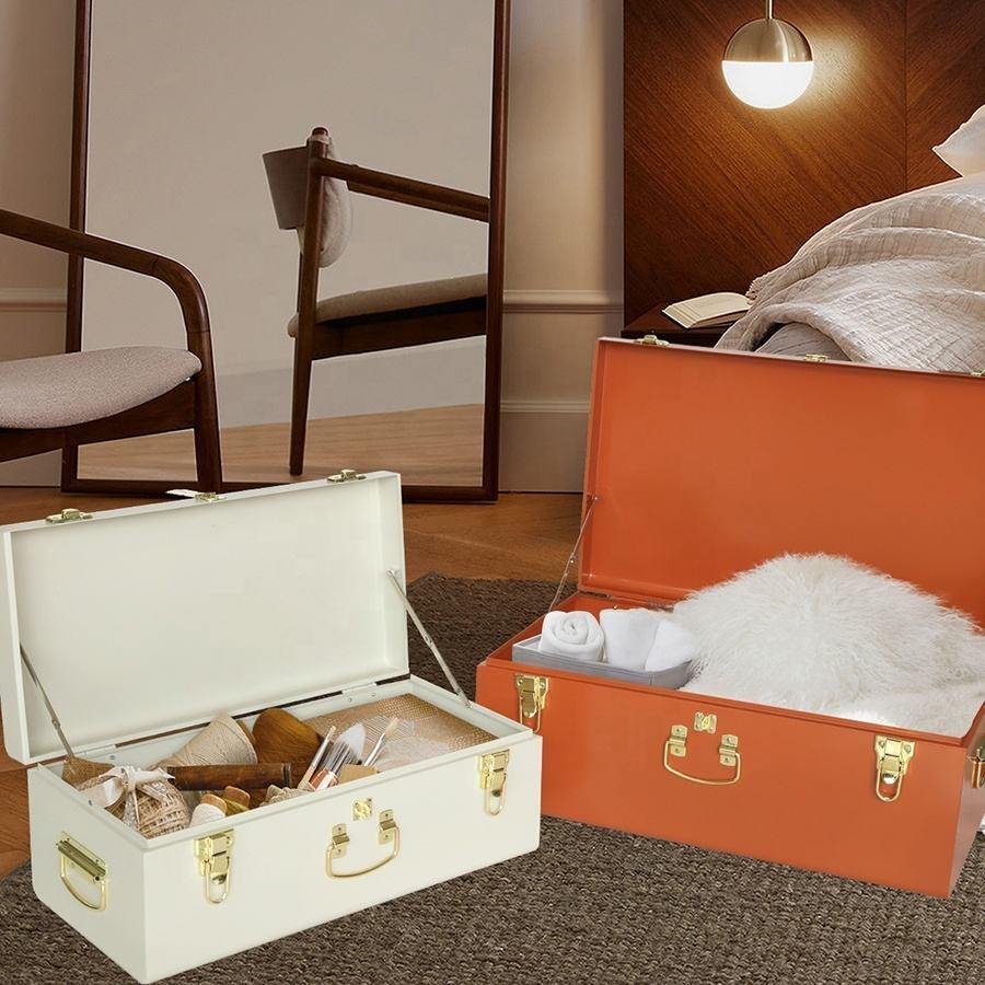 Set of 2 Decorative Metal Storage Trunks with Hardware Hasps Beige and Orange Keepsake Chests for Home Decor