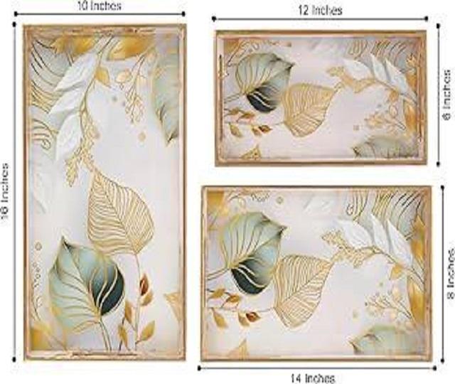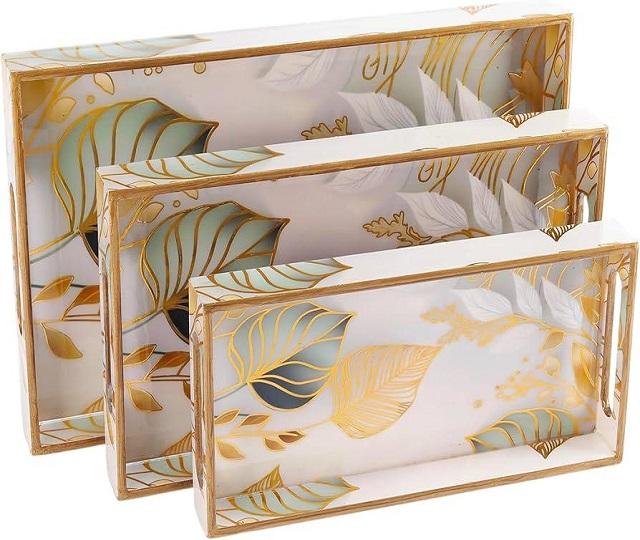Set of 2 Handmade MDF Wood Serving Trays Enamel Coated White Gold Birds Design Decorative Resin Plate Kitchen Dining Home Use