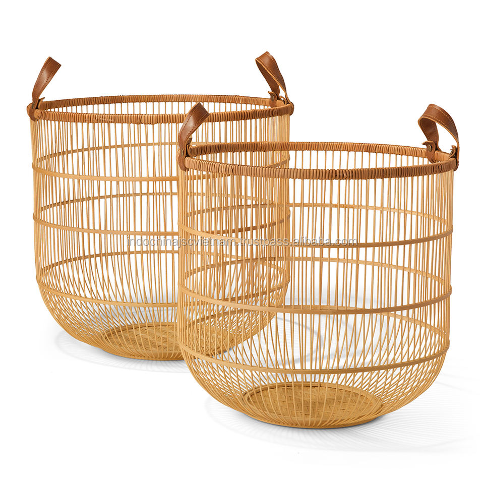 Set of 2 Naturals Bamboo Basket With Faux Leather Handle Wholesale