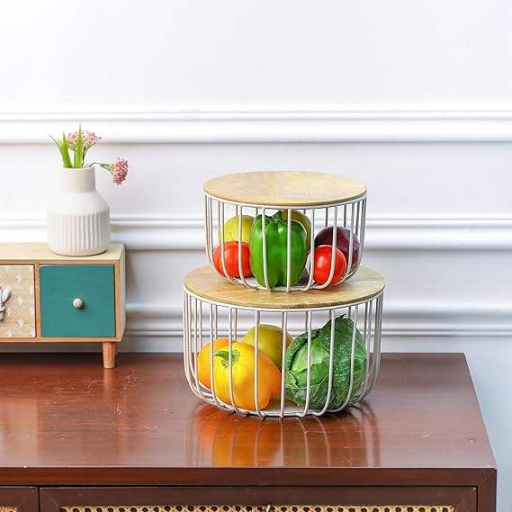 Set of 2 Nested Wire Metal Baskets Grey Wood Trays for Convenient Food Storage
