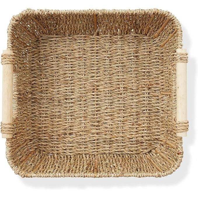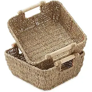 DreamCraft Set 2 Seagrass Oval Storage Baskets Wood Handles Small Woven Bin Organizers Vietnam Kitchen Bathroom Living Room