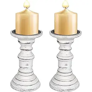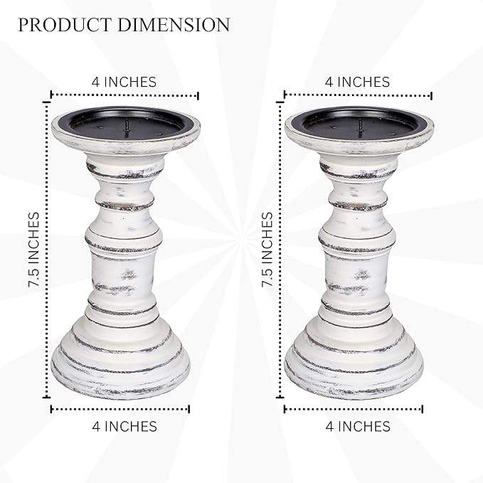 Set of 2 White Antique Wooden Pillar Candle Stands 7.5\" Turned Columns Rustic Aromatherapy Votive Candle Holders for Weddings