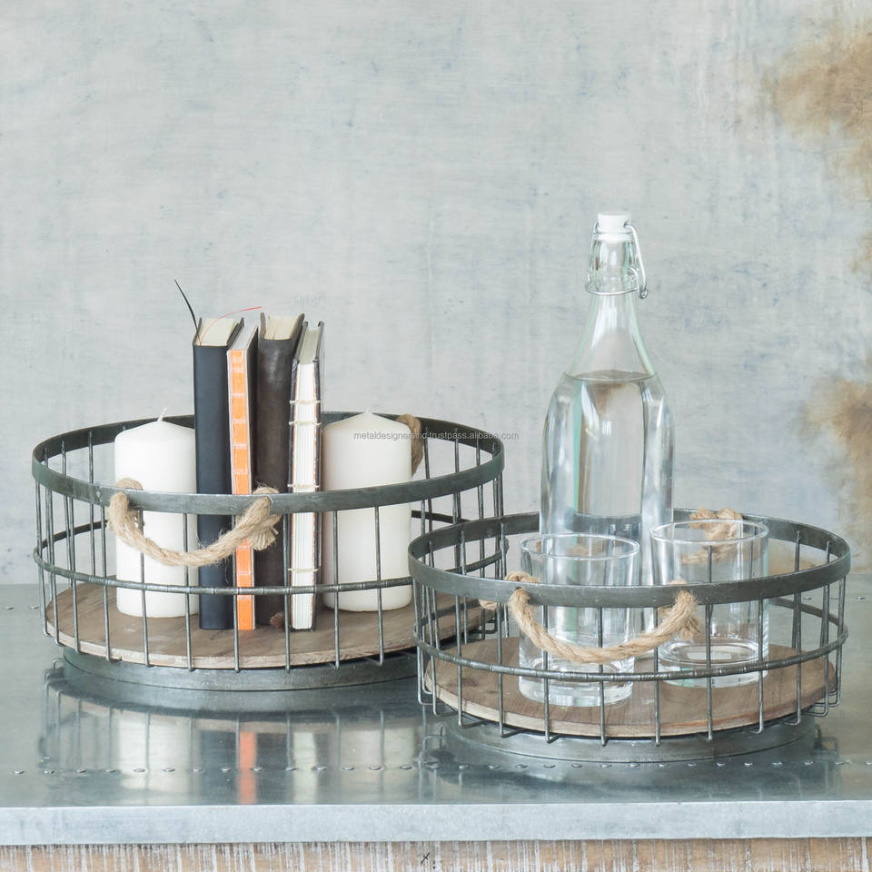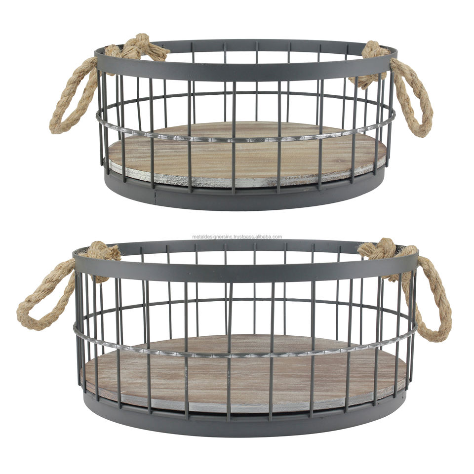 Set of 2 Coastal Wire Storage Baskets with Rope Handles Multipurpose Kitchen Tableware Made of Durable Metal