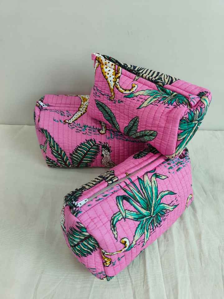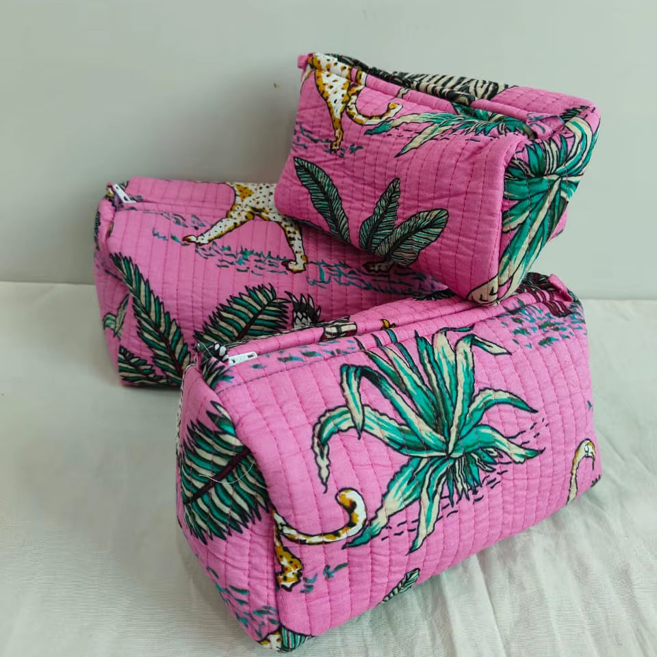 Set of 3 Cotton Quilted Makeup Bags with Animal Print Zipper Closure-Lightweight Travel & Cosmetic Organizer