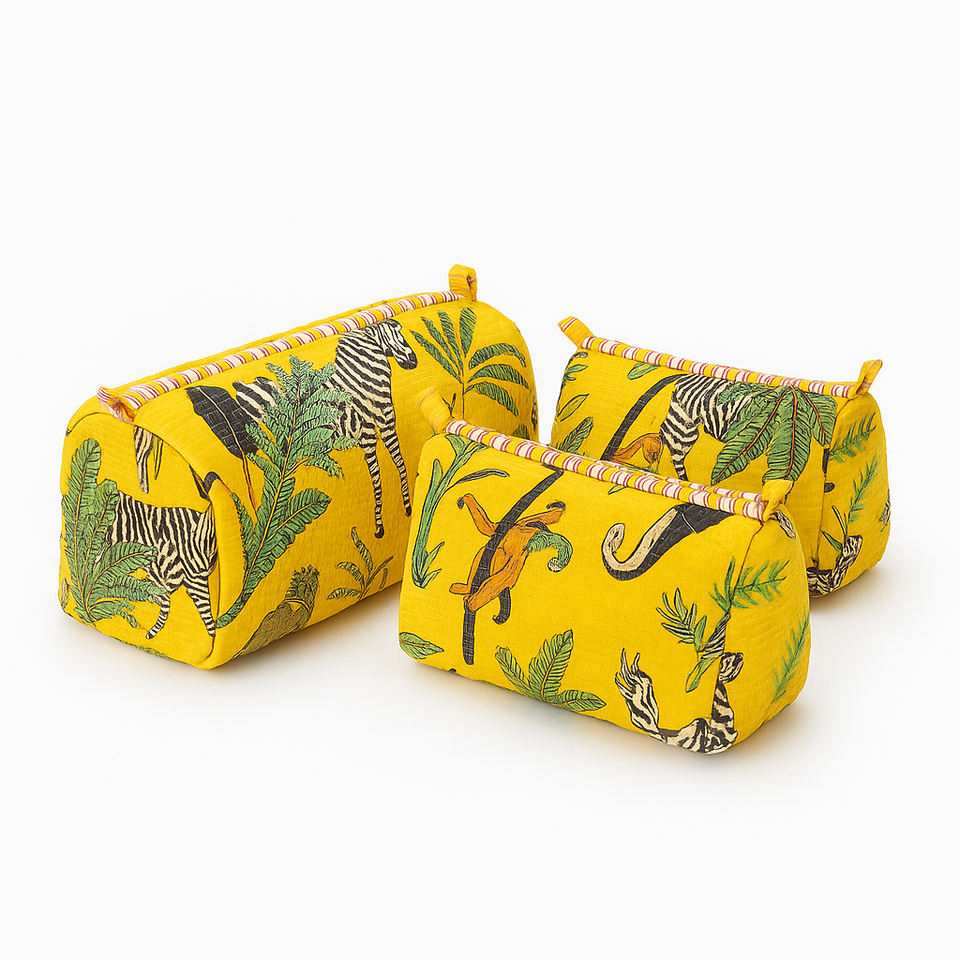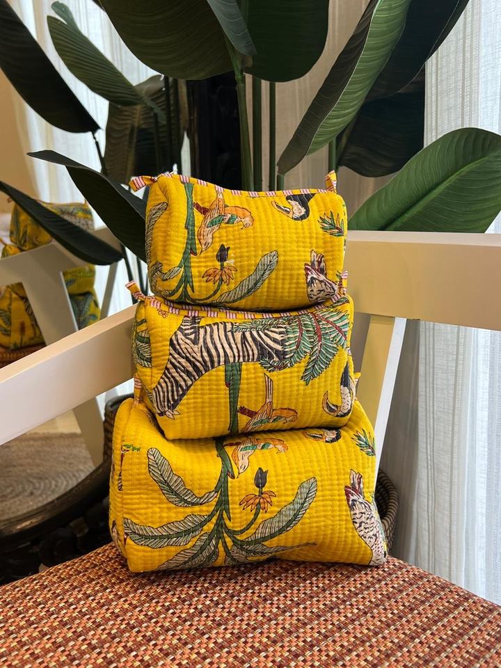 Set of 3 Eco-Friendly Vintage Yellow Jungle Quilted Cotton for Bags Zipper Closure-Durable Water Resistant Makeup Storage
