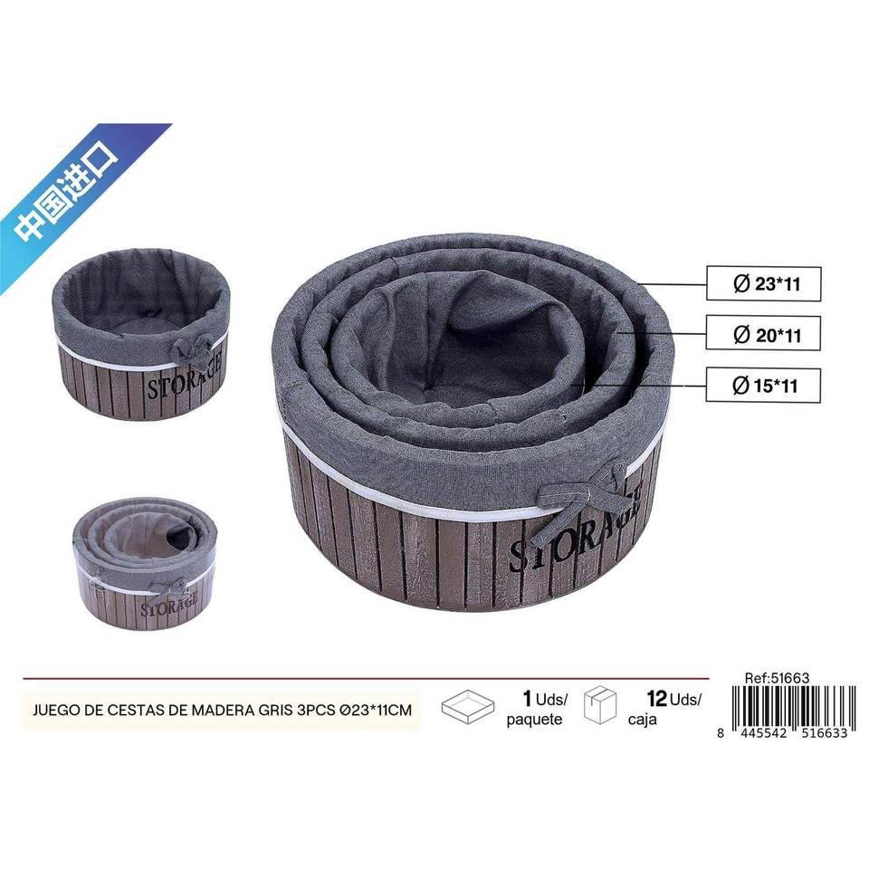 Set of 3 Grey Wooden Baskets Ø23*11 cm with Lid Natural Rattan Fruit Baskets for Home Decoration