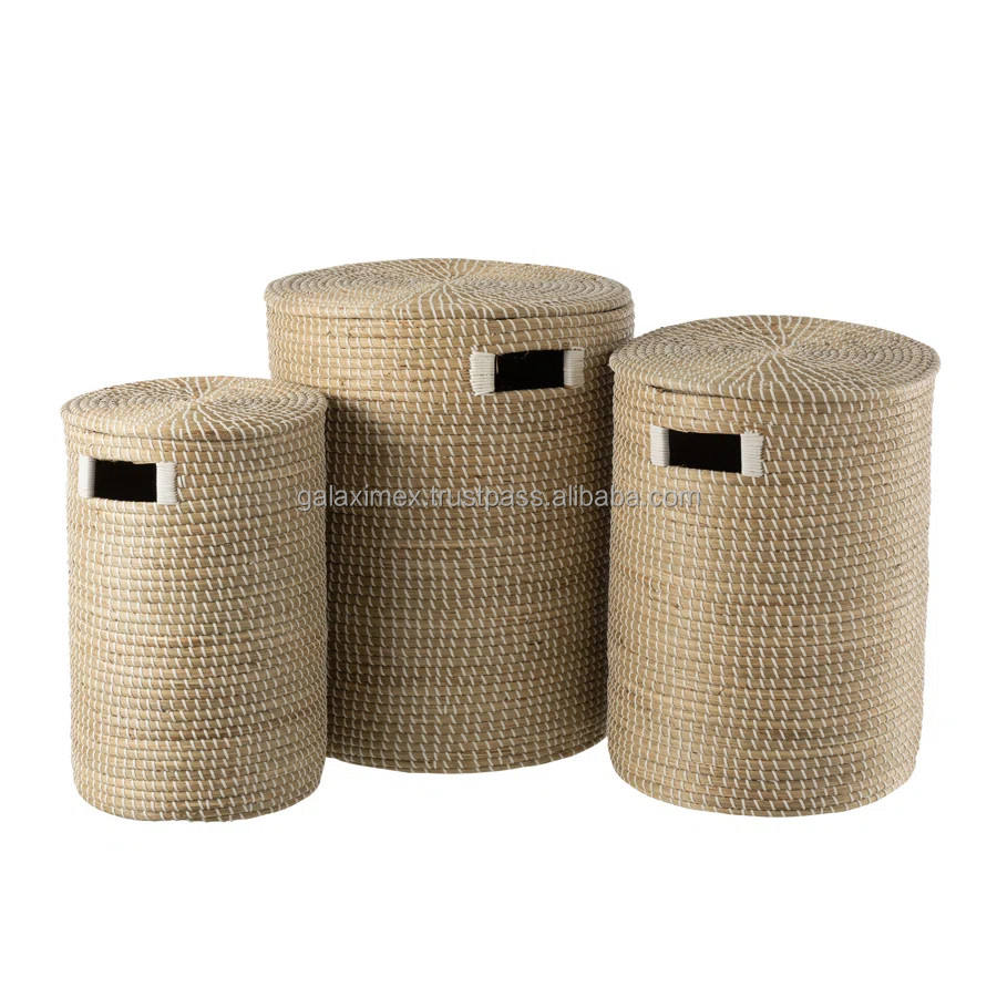 Set of 3 Handcrafted Natural Seagrass Wicker Hamper Baskets with Lids Vietnam-made Storage Containers for Bathroom Accessories