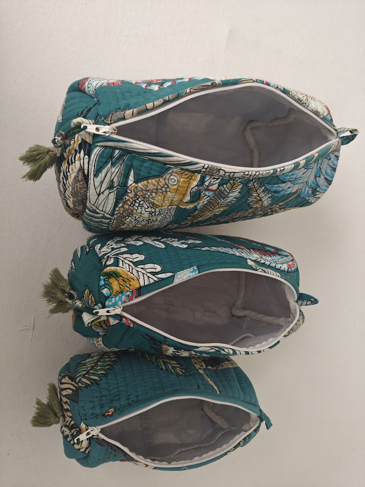 Set 3 Handmade Quilted Indian Floral for Pouches Eco-Friendly Block Printed Cotton Large Capacity Makeup Bags Durable