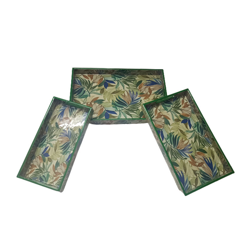 Set of 3 Hot-Selling Unique Mango Wood Rectangular Decorative Hand-made Enameled Botanical Print Tabletop Serving Storage Tray