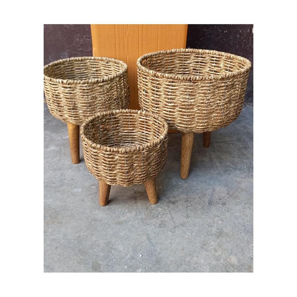 Set of 3 Jute Rope Handwoven Basket Planters Wicker with Wooden Stand for Indoor and Outdoor Decor Flower Pots