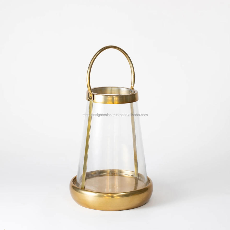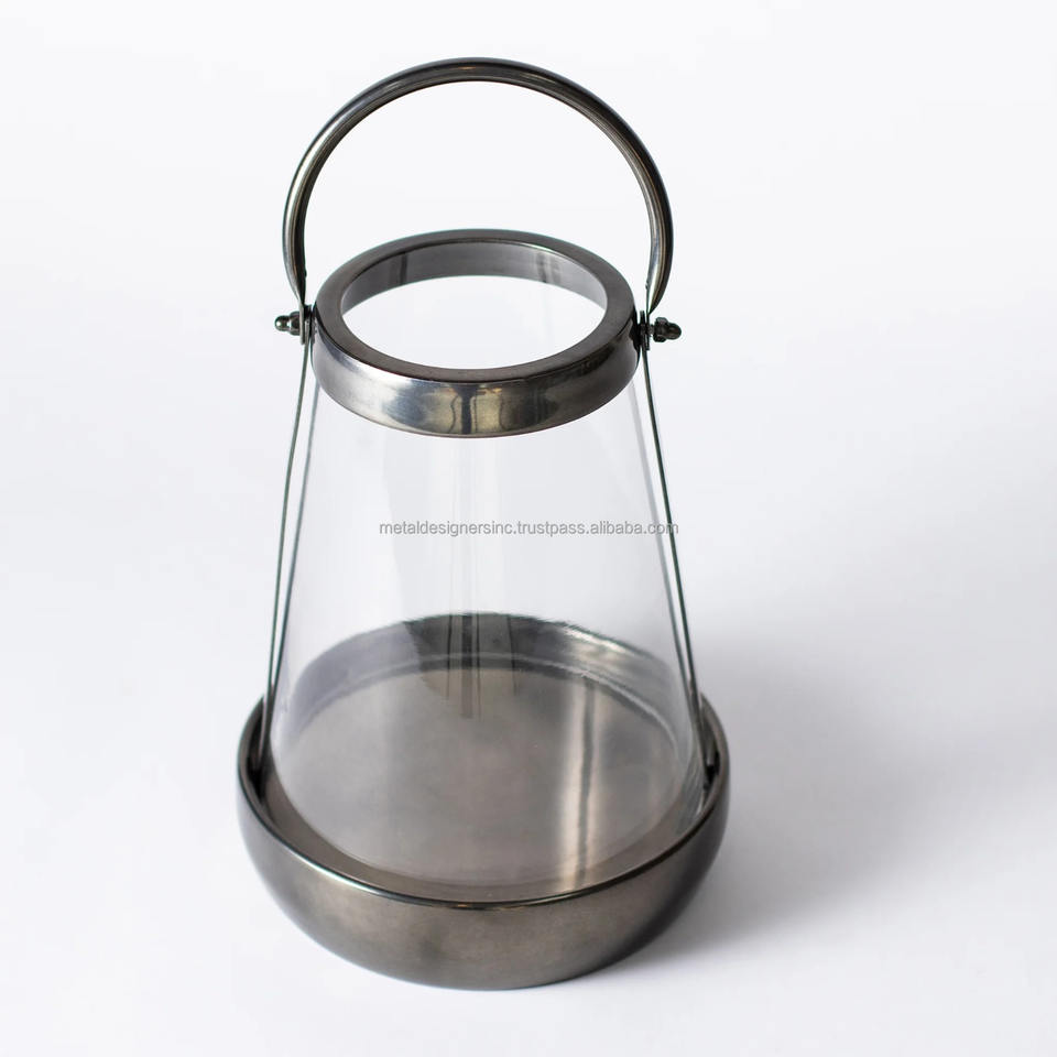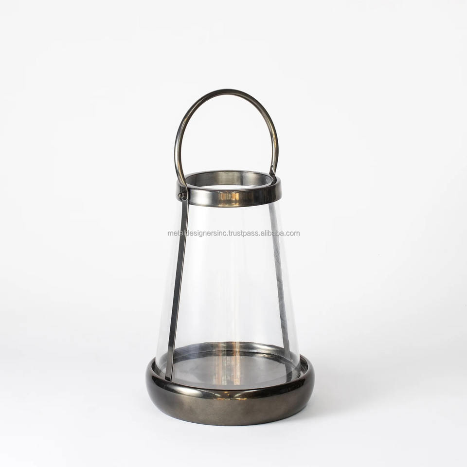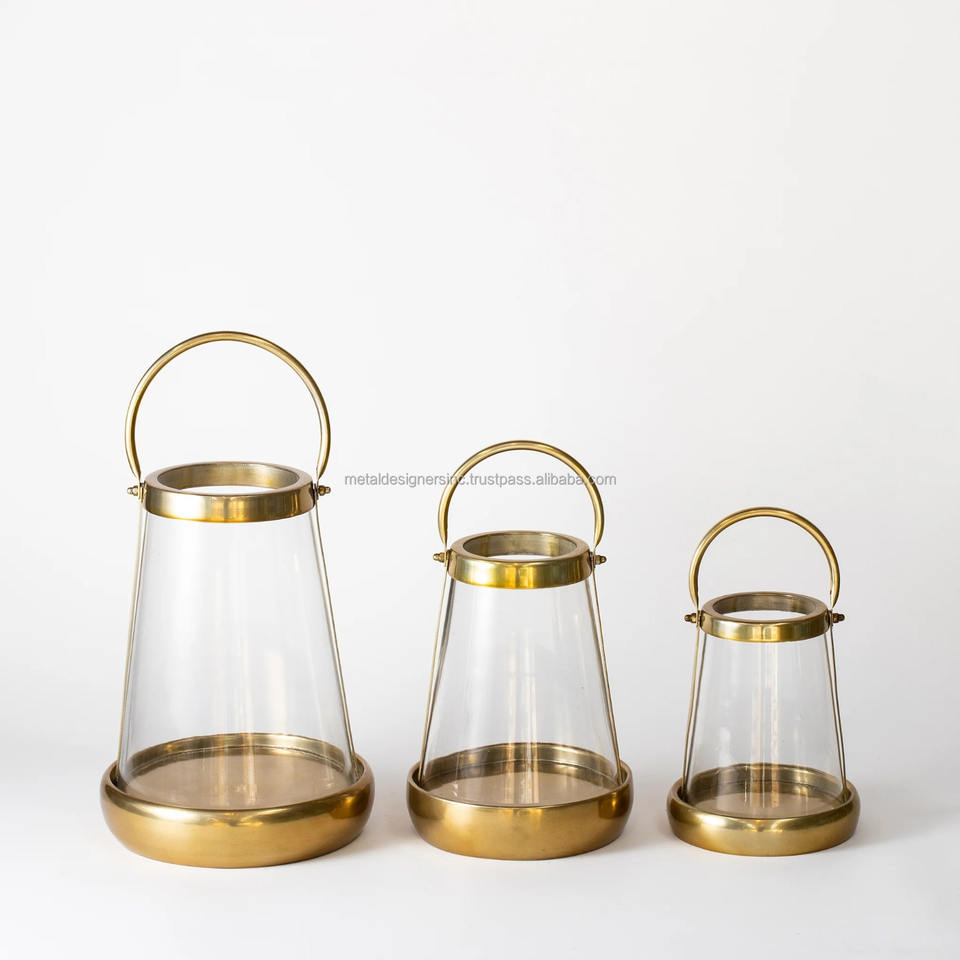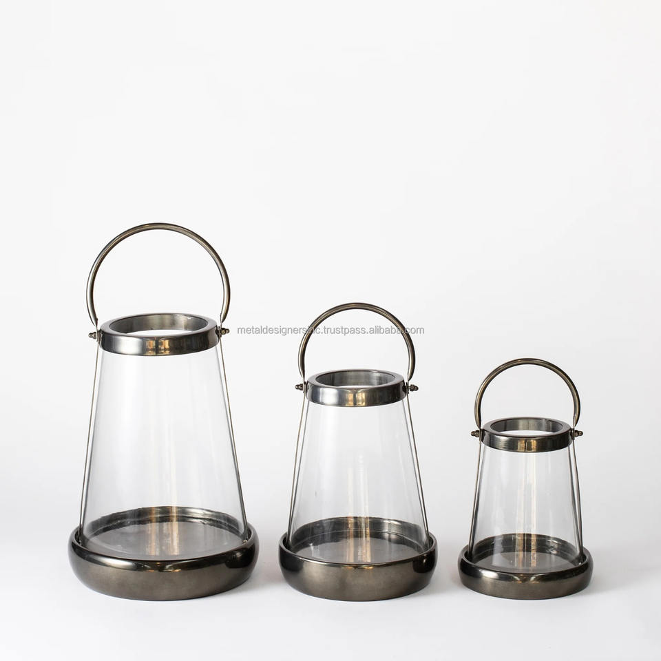 Set of 3 Modern Slim Black & Gold Glass Lanterns, Metal Candle Holders Lantern for Home Decoration