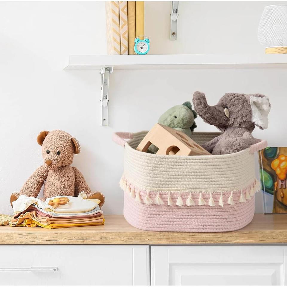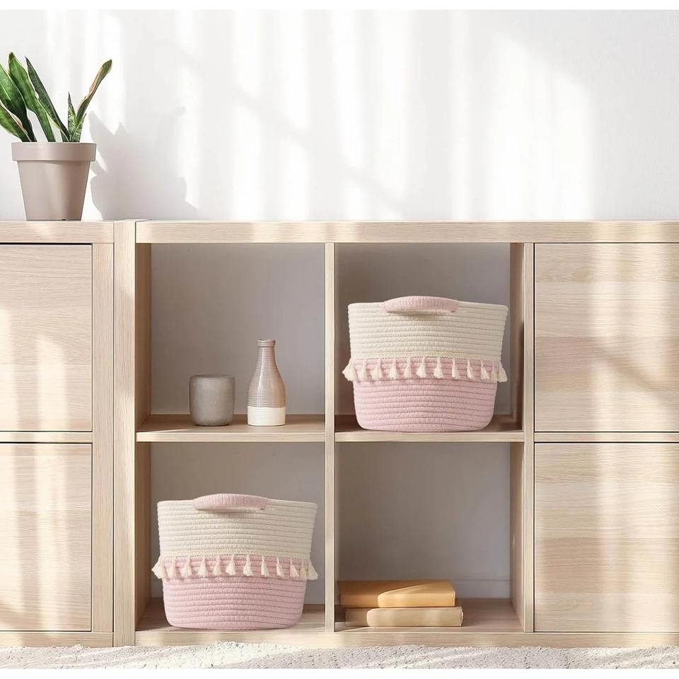 Set of 3 Pink and White Macrame Fiber Baskets Handmade Storage Organizer for Dressing Vanity Skincare and Accessories From India