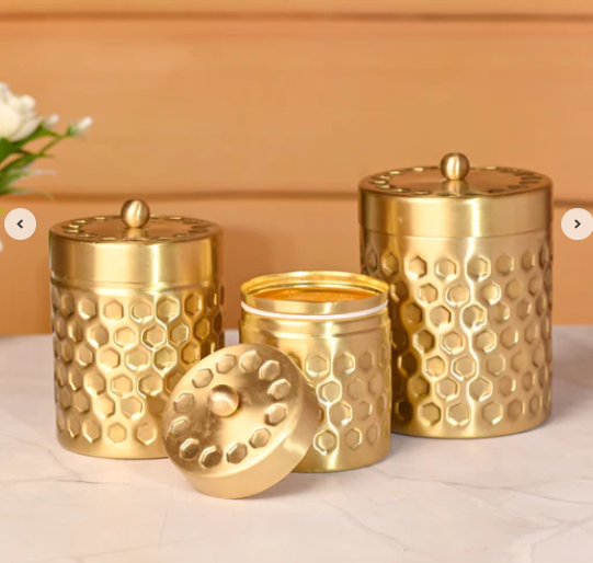Set of 3 Premium Containers Brass Diamond Hammered Storage Jars with Lids