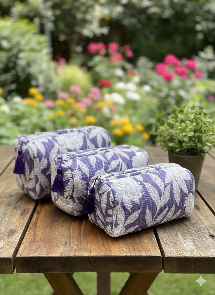 Set of 3 Purple Vintage Eco-Friendly Cotton Waterproof Durable Makeup Storage Cases Zipper Closure (Large/Medium/Small Sizes)