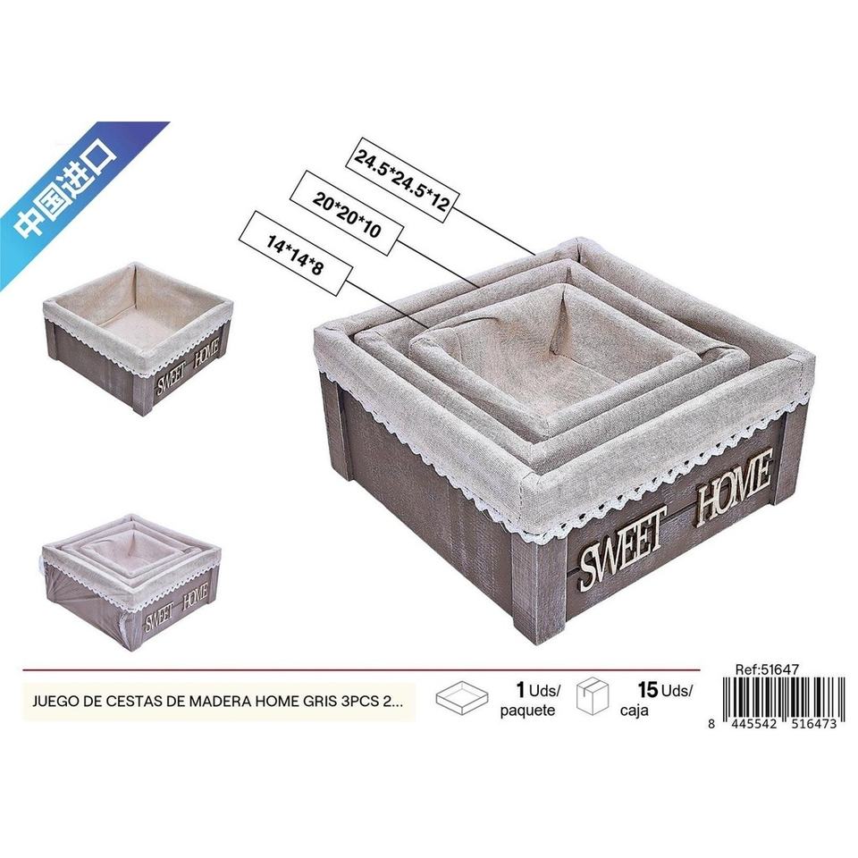 Set of 3 grey wooden baskets 24.5x24.5x12cm for storage and decoration