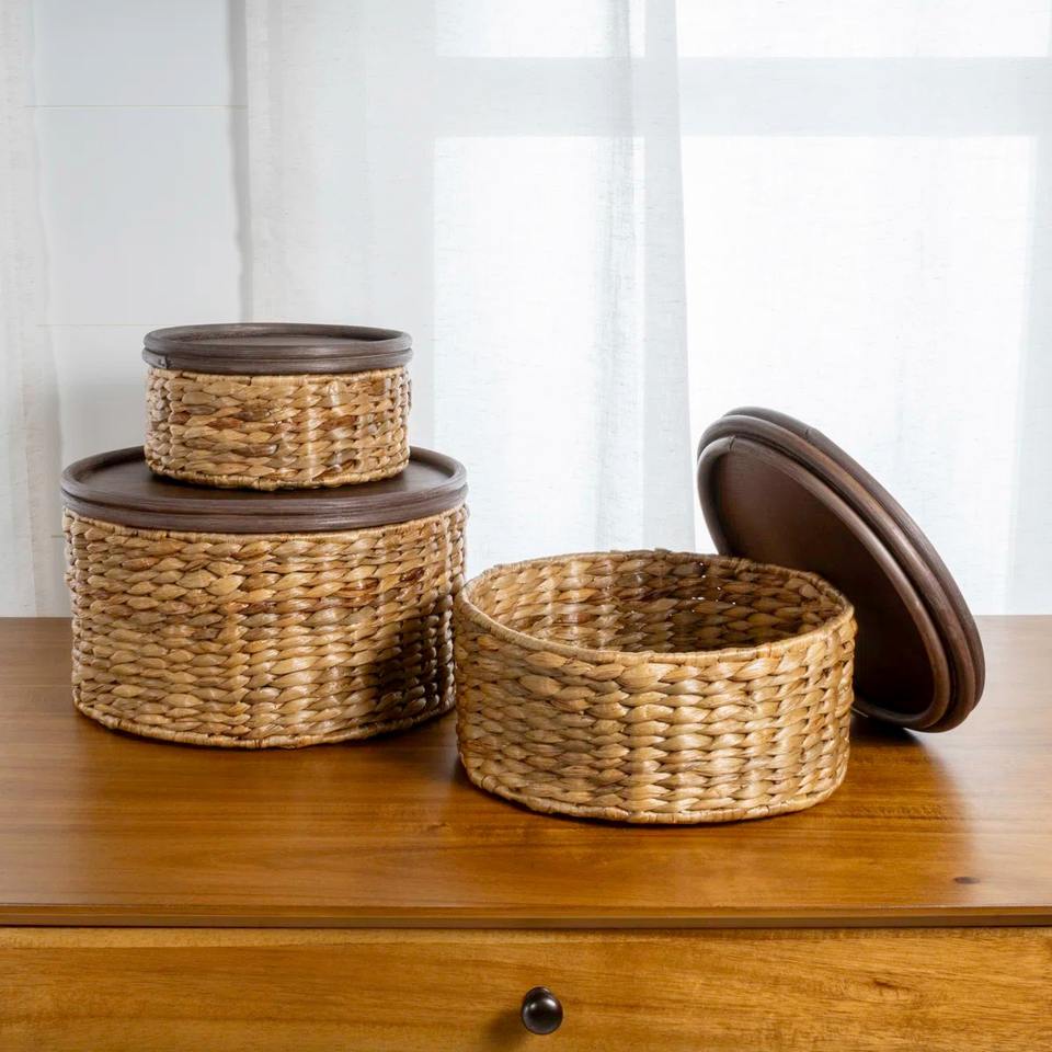 Name:Set of 3 round boxes water hyacinth with rattan lids