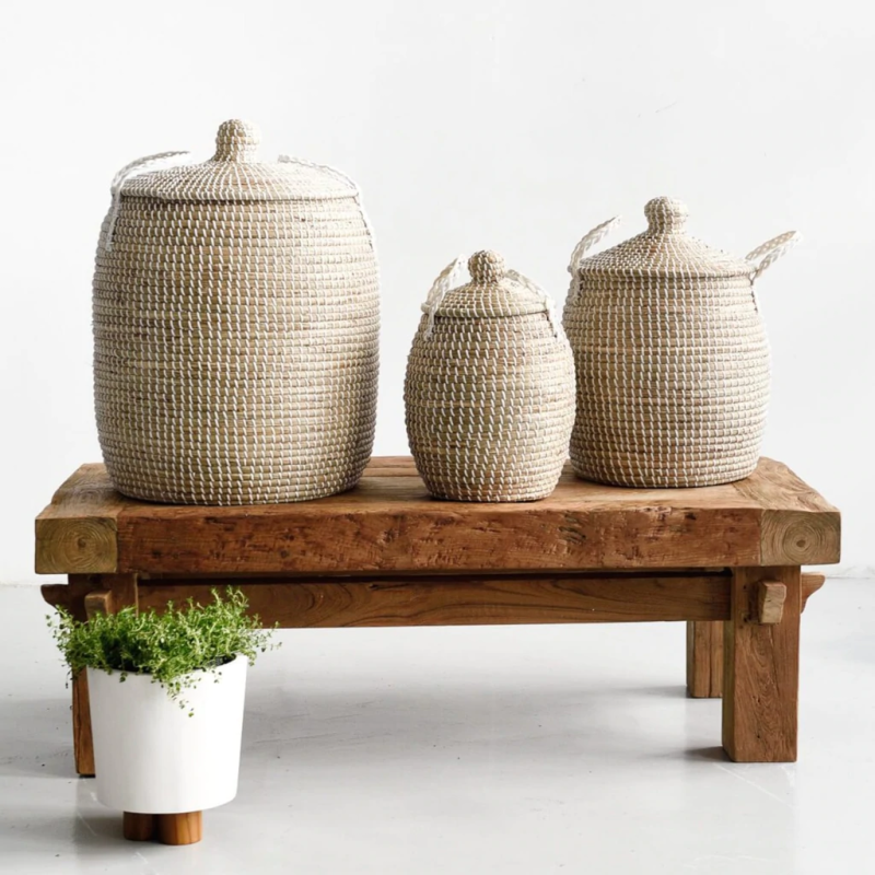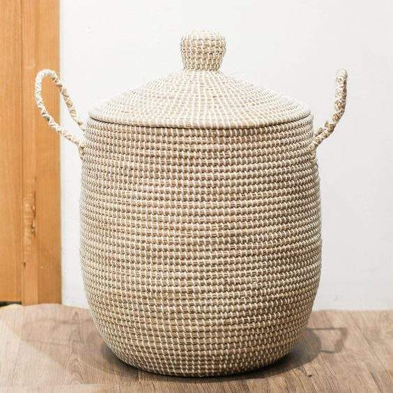 Set of 3 Seagrass Storage Baskets with Handles Lids Plastic Cloth Material for Kitchen Bathroom Clothing Jewelry Storage Vietnam