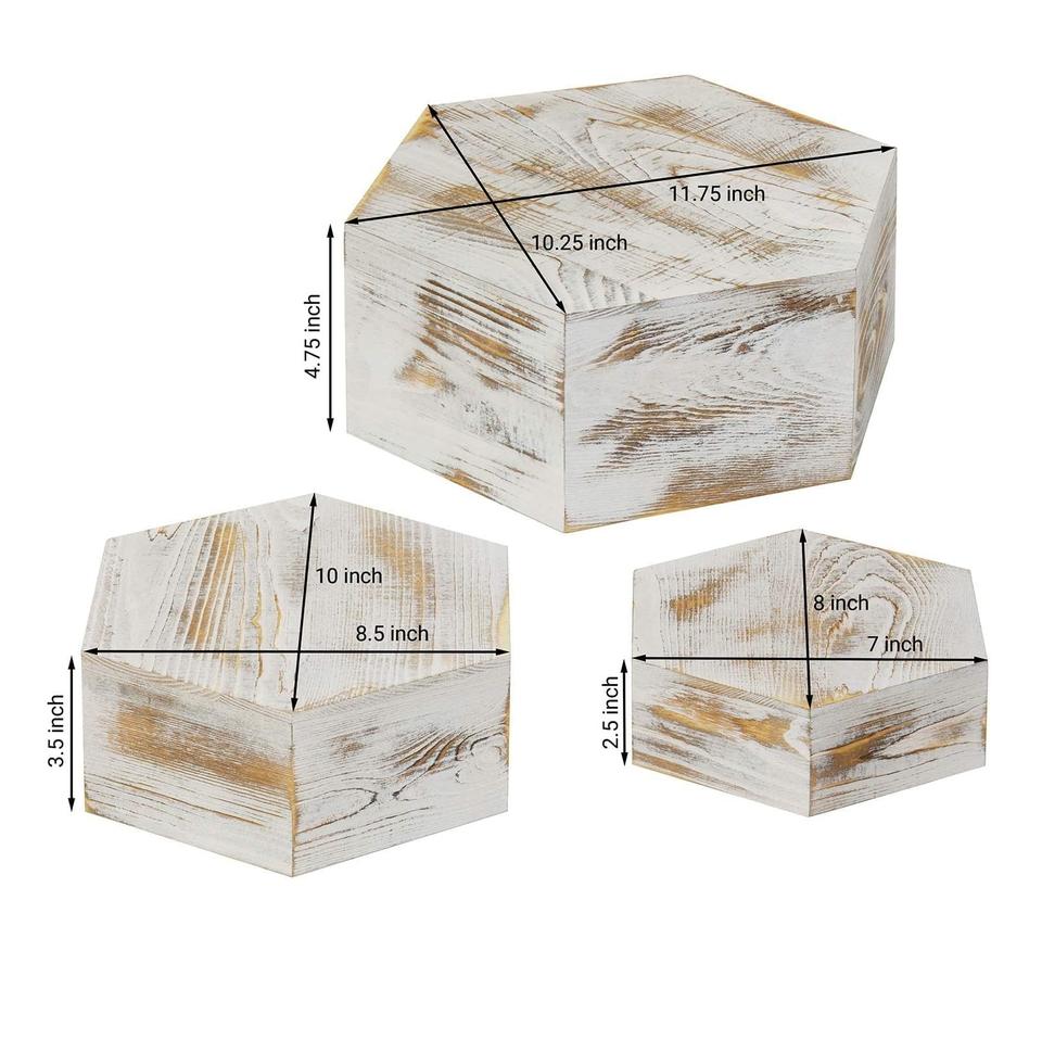 Set of Three Whitewashed Wooden Hexagonal Display Riser Stands for Rustic Event Decor, Retail Showcases, and Home Styling