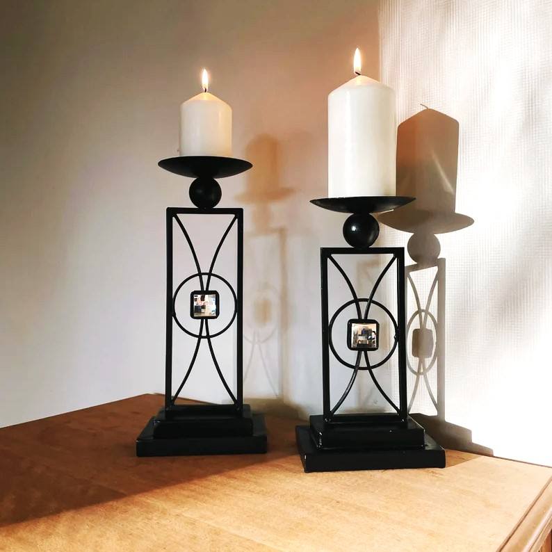Set of Two Unique Design Black Metal Pillar Candle Holders High Thick Iron Candle Stand For Home Decoration Christmas Birthday