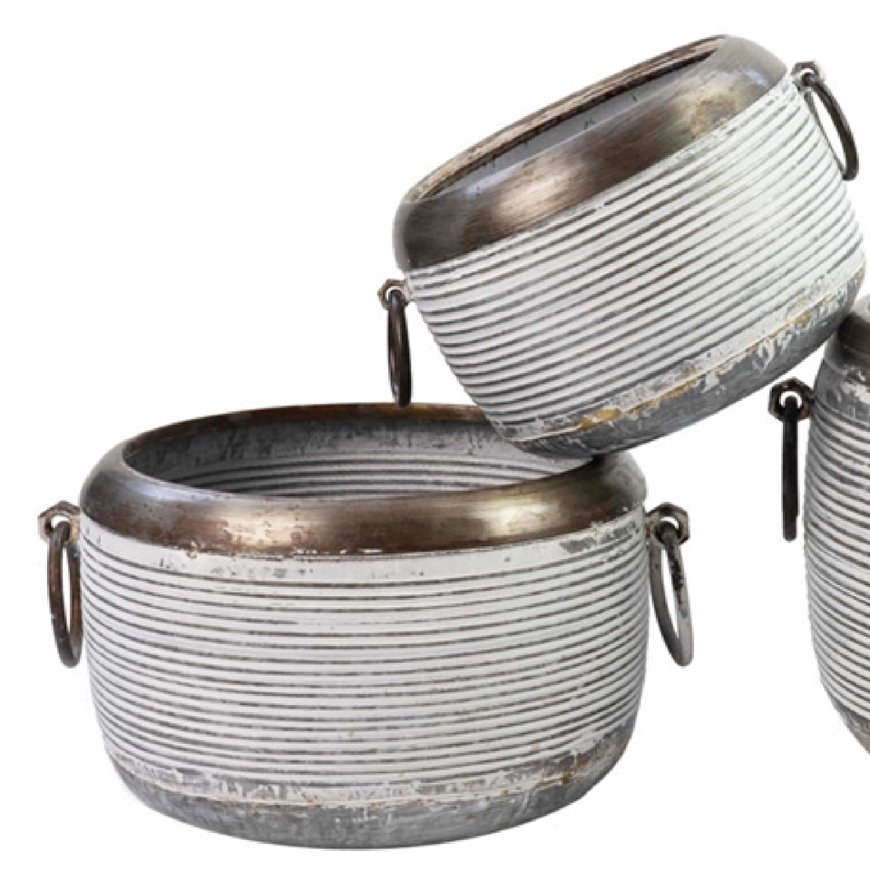 Set of distressed, ribbed metal planters with dark rustic handles, featuring a weathered white and brown finished