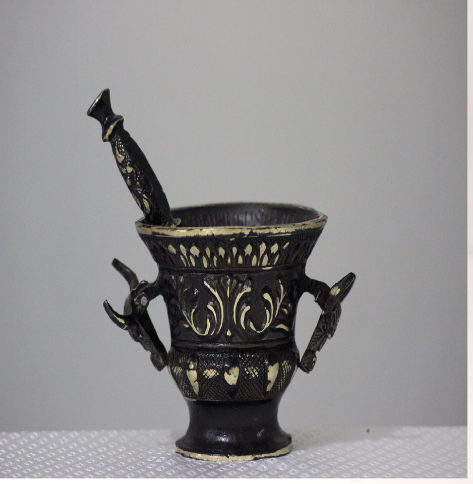 Set of three brass mortar pestles with lion face carving. High-shine tool set, available at whole sale price.