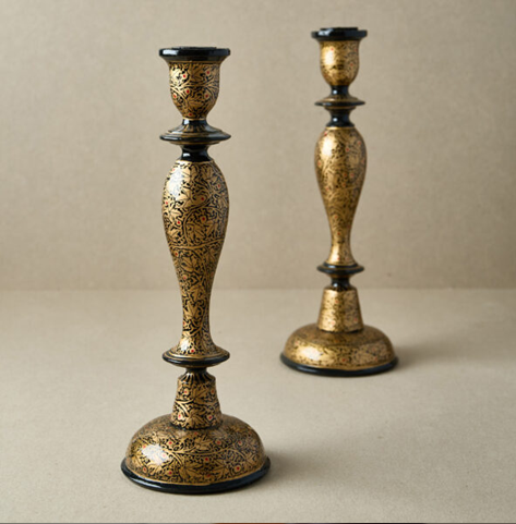 Set of two modern wooden candle stands with black and natural contrasting two-tone finish, at wholesale prices.