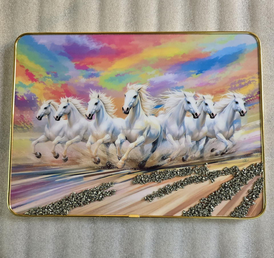 Seven Running Horses Wall Art in Elegant Frame Crystal Pyrite Healing Home Decorative Frame Lucky 7 Horses Framed Wall Print