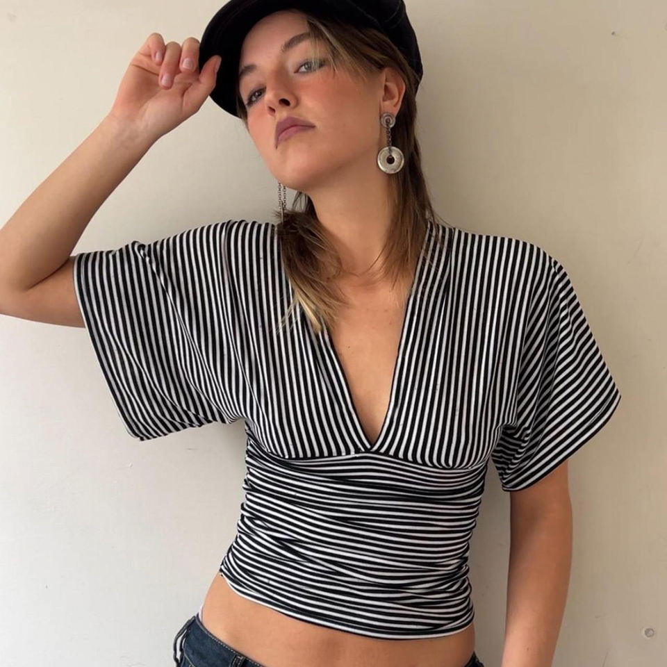 Sexy Hot Girl INS Streetwear Striped Deep V Neck Slim Fit Short Sleeve Crop T-Shirt Women Backless Waist Shaping Top