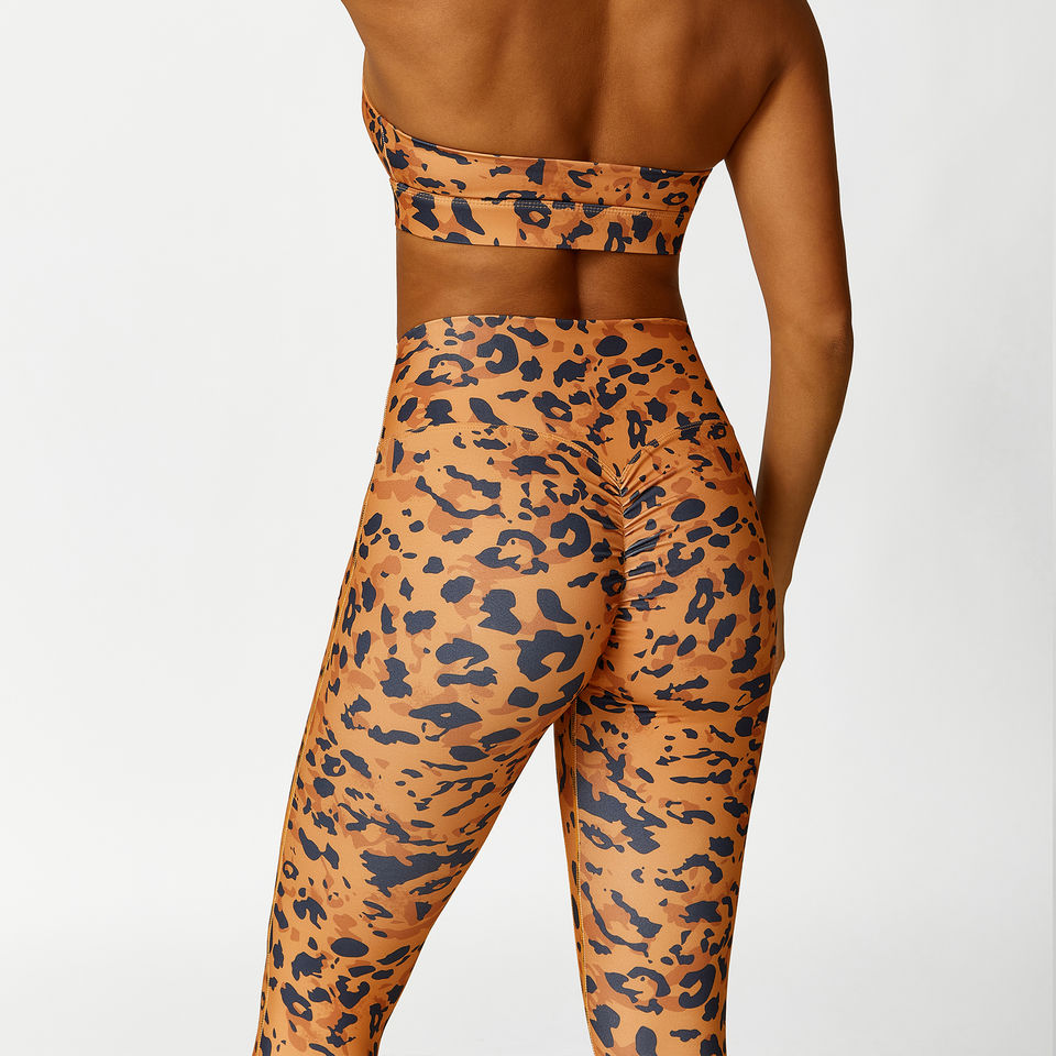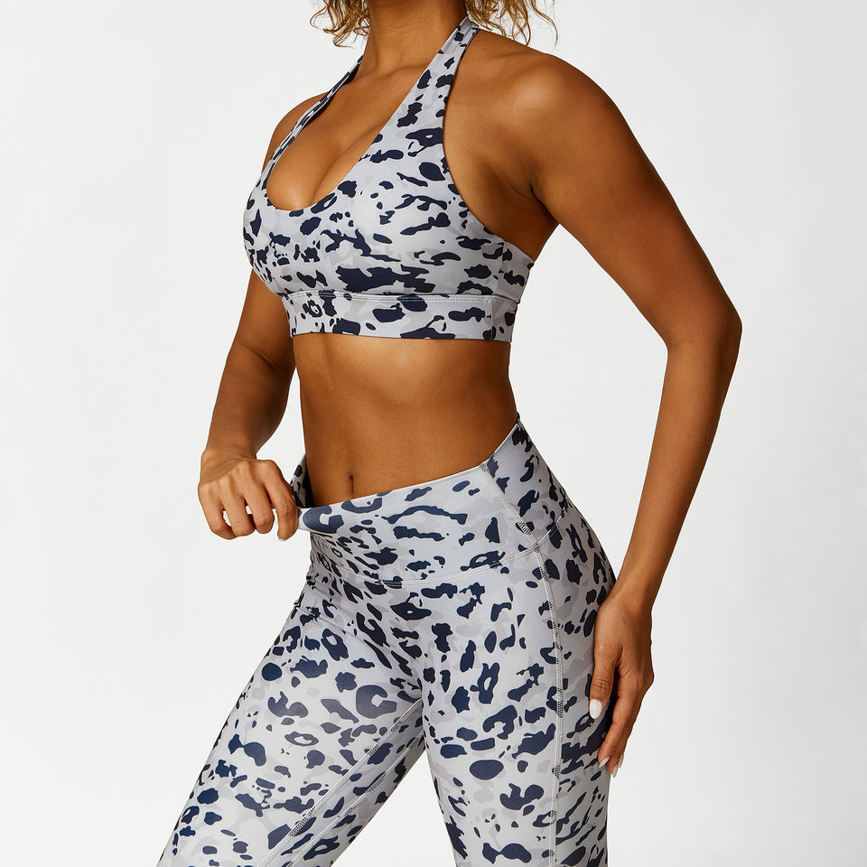 Sexy Leopard Set Halter Neck Bra Crop Backless Scrunched Butt Leggings High Waist V Cut