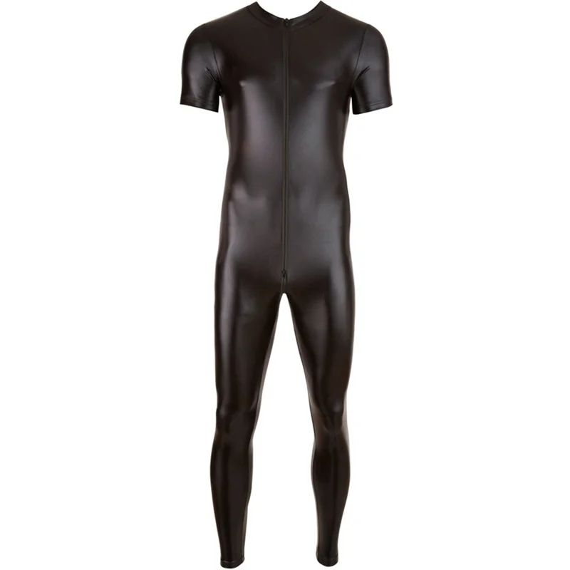 Sexy Mens PU Leather Catsuit Men's Tight Skin Full Bodysuit Jumpsuit Front Zipper Open Crotch Latex Zentai Suit Fetish Bodysuit