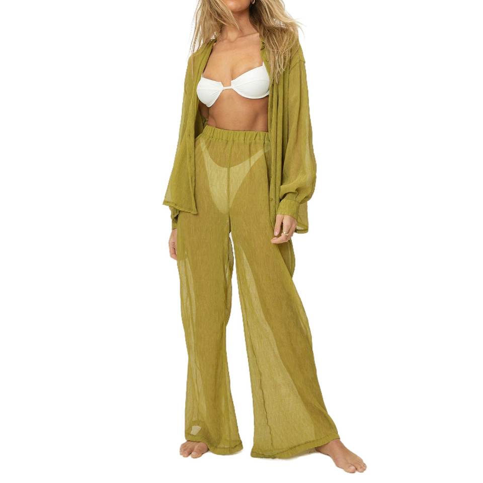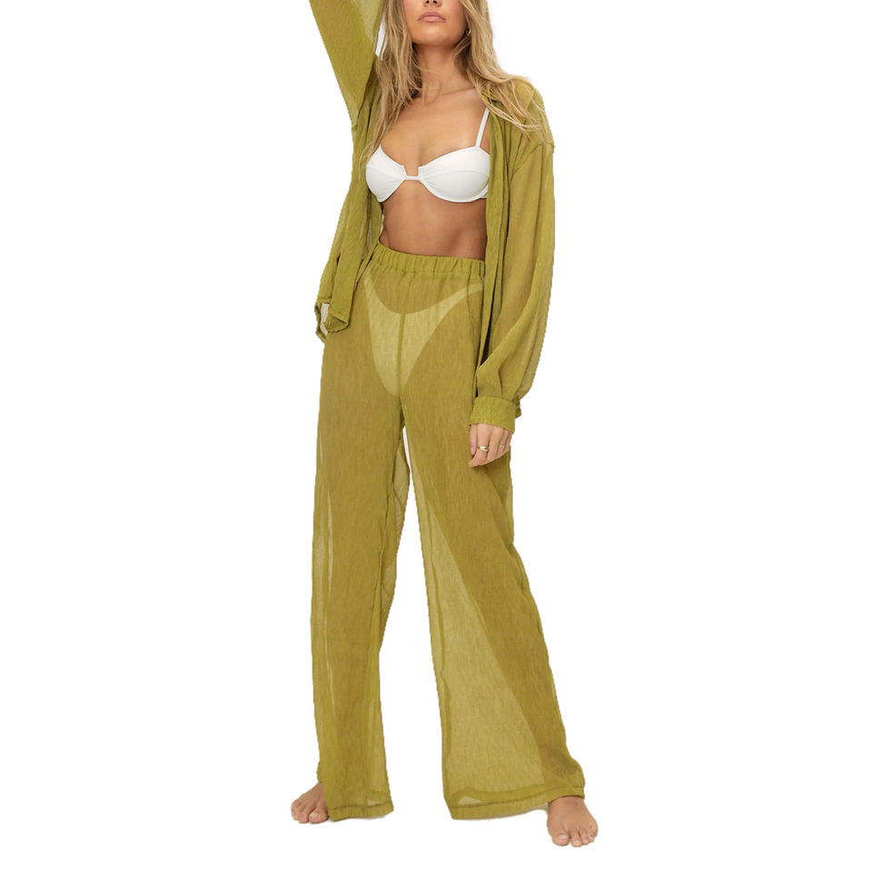 Ladies' Sexy Night Open Button Casual Shirts and Sheer Mesh Leggings Solid Pattern Two-Piece Sets with Stand Collar