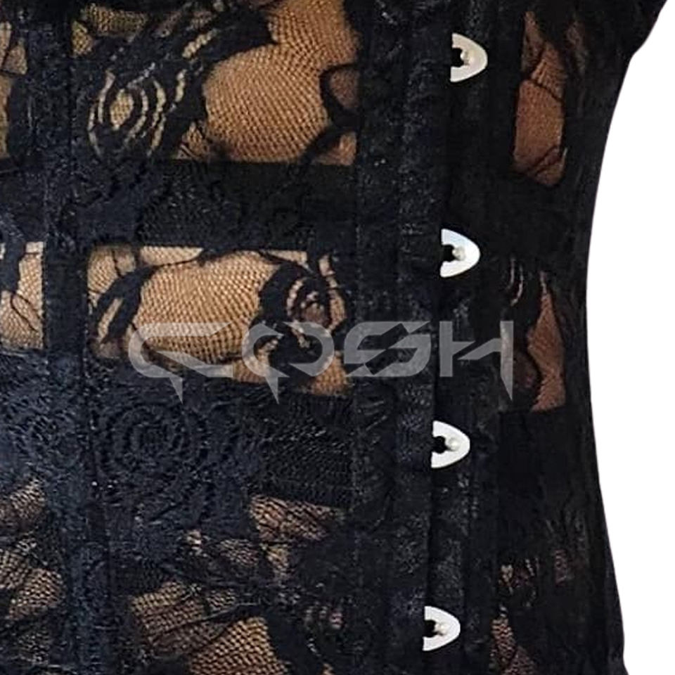 Sexy Overbust Black Floral Lace Overlay Steel Boned Overbust Corset and Matching Full-Length Mesh Leggings