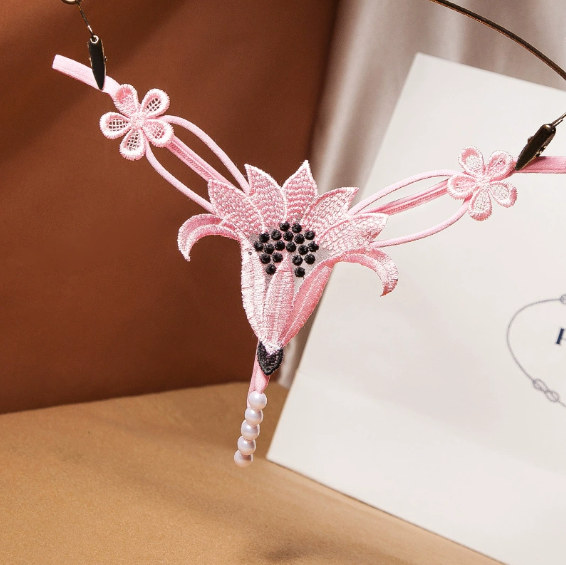 Sexy Transparent Floral Embroidery Pearl Open Crotch Panties Women's Thong Plus Size Erotic Lingerie