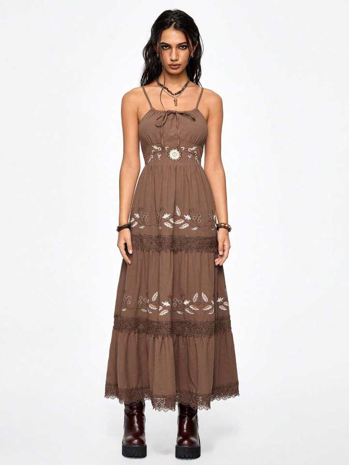 Sexy Women's Brown Applique Embroidery 100% Cotton Woven Maxi Dress for Summer Square Collar Casual Elegant Short Sleeve