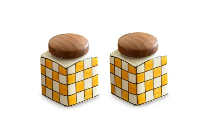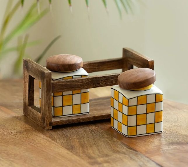 Shatranj Checkered Multi-Purpose Storage Jars & Containers In Ceramic With Wooden Holder Set of 2 Hand-Embossed Airtight