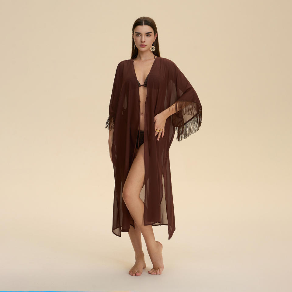 Sheer Satin Sexy Breathable Knee-Length Summer Oversized Kimono Robe with Fringe Trim for Women