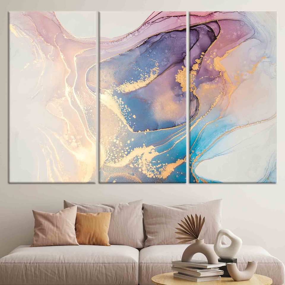 Shimmery Glass Wall Art: Printed Canvas with Elegant Blue Marble Design,SET OF 3 CANVAS