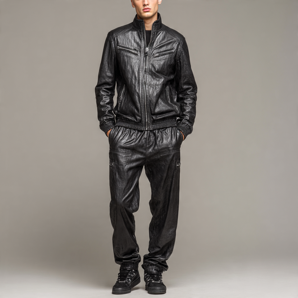 Shine Leather Suits Men's Stand Collar Jacket Biker Leather Pants Set Men Casual Vintage Fashionable Leather Suit Men's